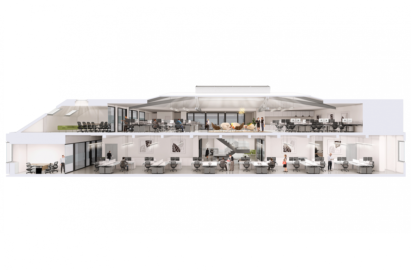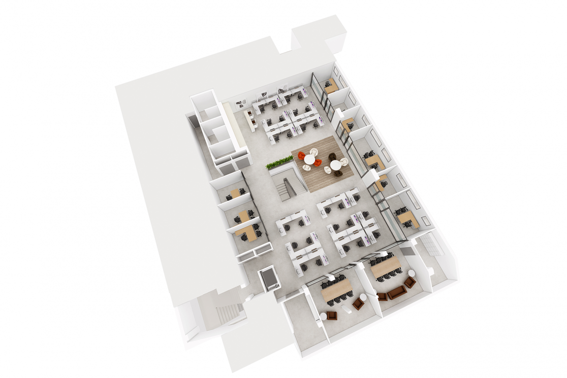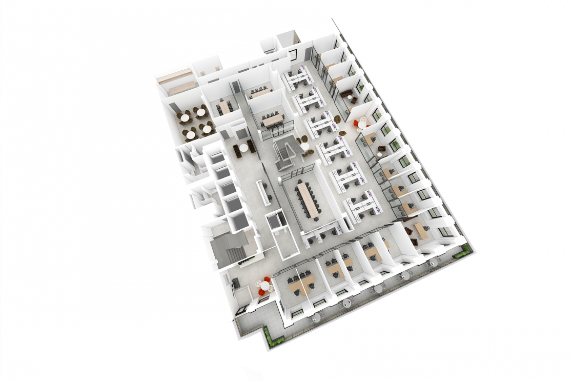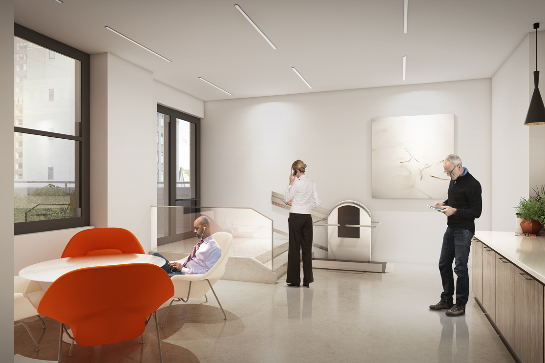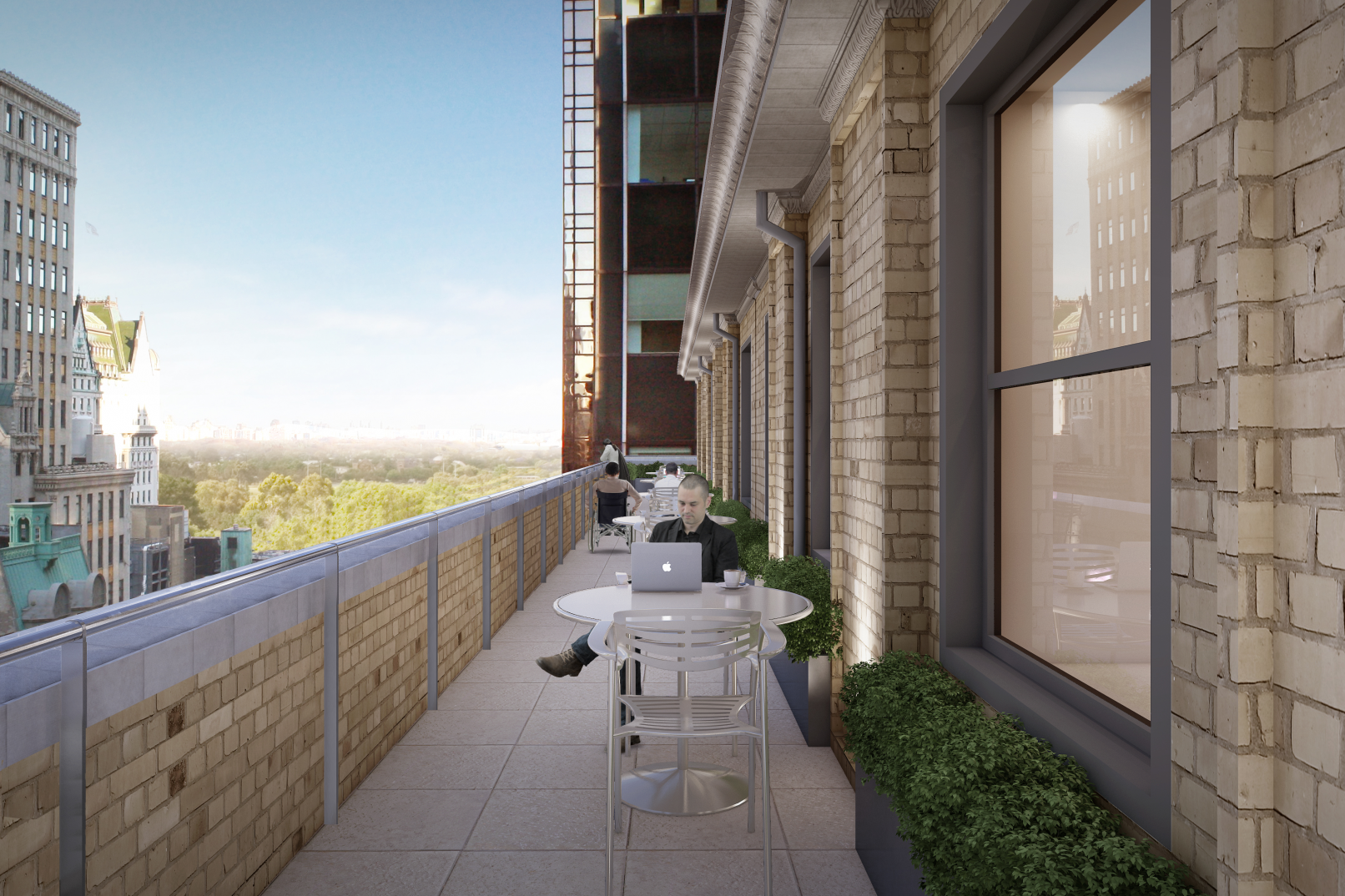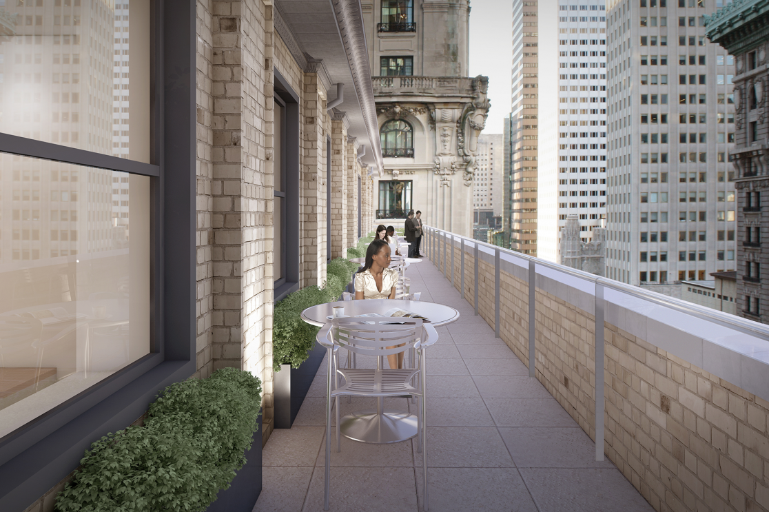 Janko Rasic Architects transformed the top two floors of the building into a unique loft-like space ideal for a TAMI (Technology, Advertising, Media, and Information) tenant. Low dropped ceilings associated with the “traditional office” of yesterday were removed to expose the concealed attic. Mechanical systems were rerouted. The result is an impressive double-height volume defined by exposed steel trusses. To further enhance the new loft space, Janko Rasic Architects introduced a new energy efficient skylight spanning the entire length of the attic’s gable roof. The large expanse of glass overhead allows natural light to pour in, illuminating the space. In order to create more valuable, usable square footage, the penthouse was structurally redesigned and reinforced so that interior columns at perimeter window bays could be removed. The renovation was part of a major façade and roof restoration project undertaken by the building which required careful coordination between building owner The Coca-Cola Company, property managers Jones Lang LaSalle and multiple consultants. After the transformation, Janko Rasic Architects was asked to visualize the space for prospective tenants. The possibilities are endless. Skylights boost energy efficiency and worker productivity.  Day lighting is an important sustainable solution.  Studies show that people work and learn better under natural light.  In addition to skylights, Janko Rasic Architects designed access to wrap around terrace on the lower floor.