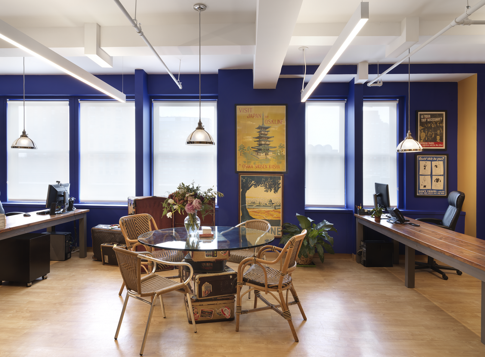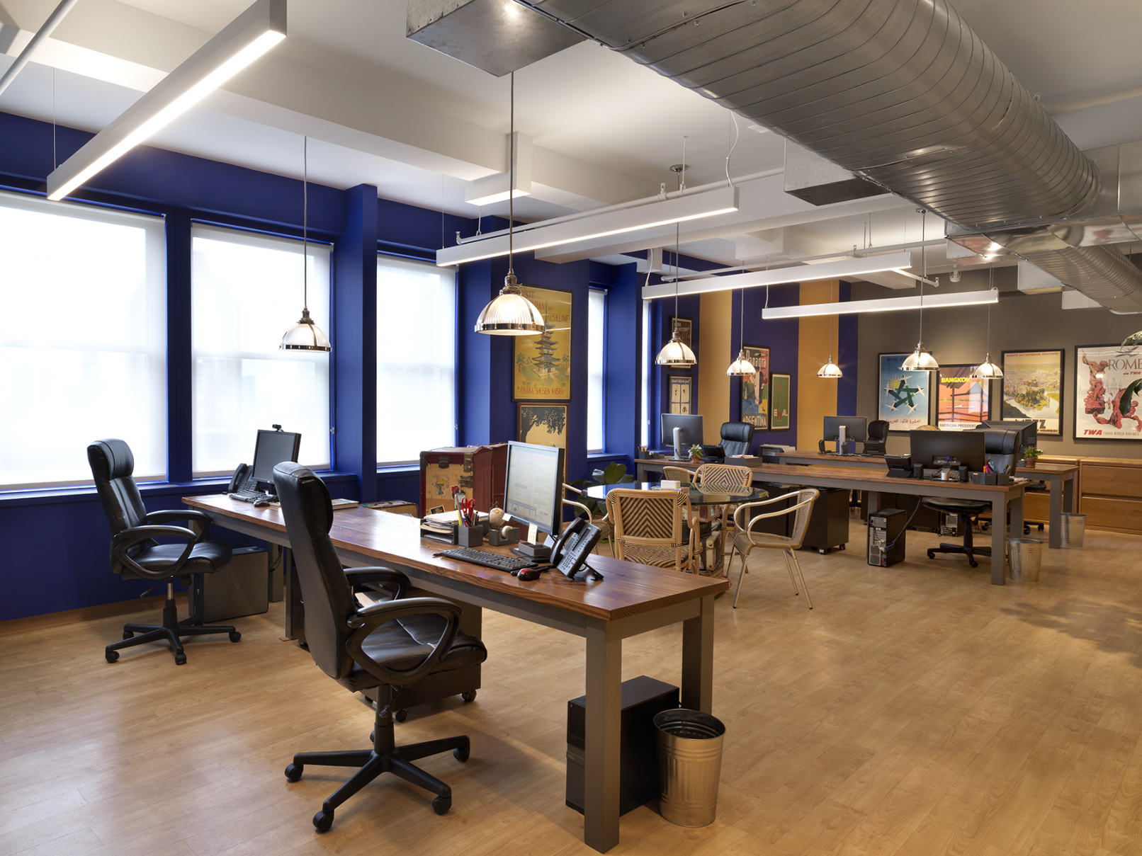 It is only fitting that this space does not feel like your typical office. Geoffrey Weill Associates, a public relations agency, specializes in travel and tourism. Geoffrey Weill, company president, says the “company was founded, and continues to be run and staffed, by people, like me, who simply enjoy writing about travel, about hotels, and the romance of taking a vacation…” You can almost take a swim in the deep blue walls. An extensive collection of vintage travel posters from around the world is displayed in a gallery like fashion. Janko Rasic Architects provided architectural support for this space as part of the landlord’s build-to-suit program.