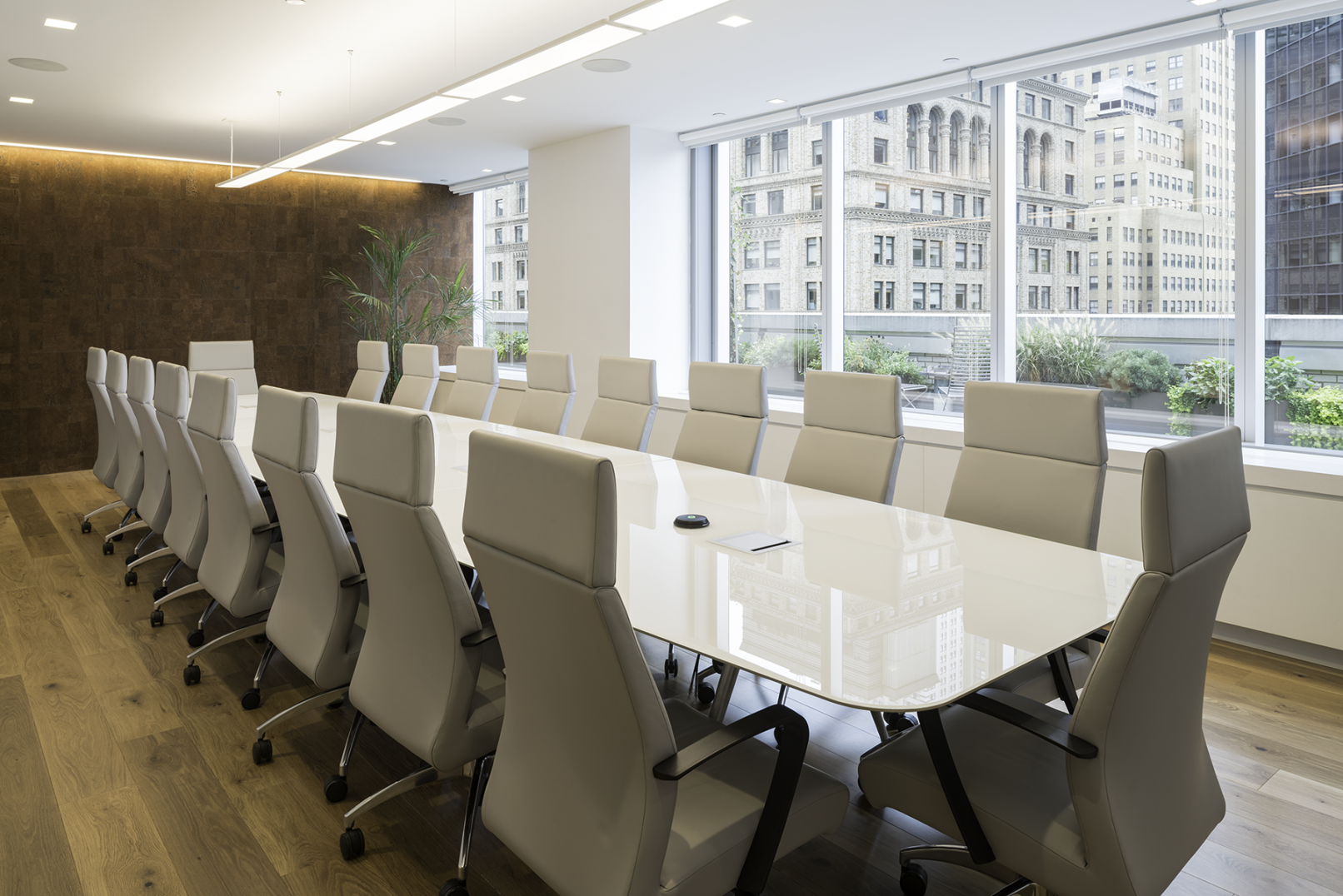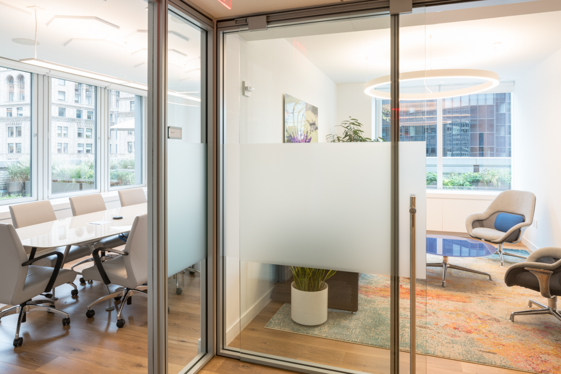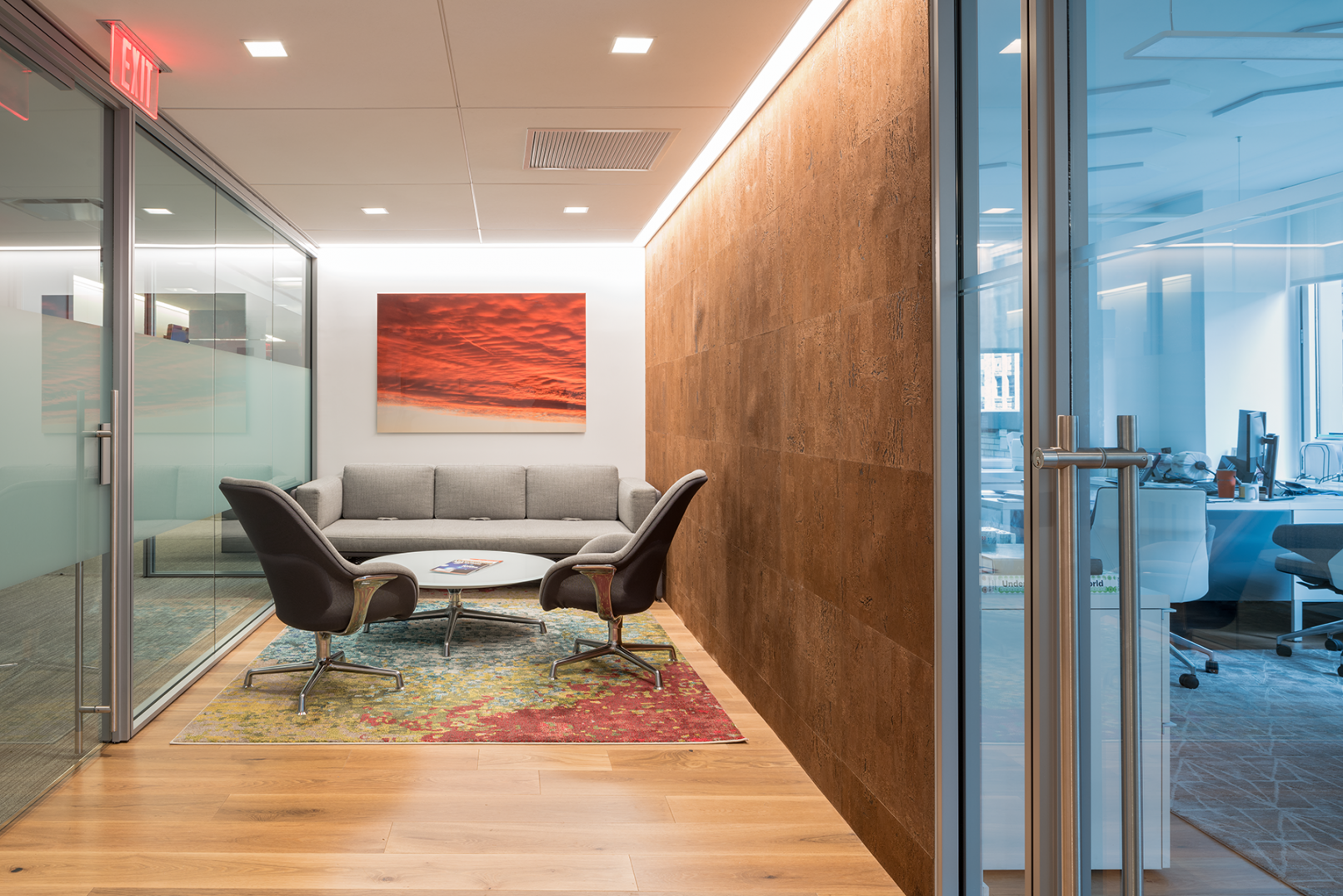 Janko Rasic Architects was asked by an International Bank to re-image the reception area of its New York office and create a welcoming client meeting area capable of accommodating groups of various different sizes. A conference room with switchable privacy glass directly off reception expands the waiting area and creates a sense of intrigue.  Light wood floors and natural accents bring warmth.   A cork wall anchors the large board room. Meeting rooms and breakout areas accommodate smaller groups.   A dedicated café and executive restroom support the meeting area   A new private CEO suite was also created adjacent to the client meeting area allowing the CEO to easily greet visiting clients.  Much of the artwork is photographs taken the Bank’s talented staff which brings a personal touch.