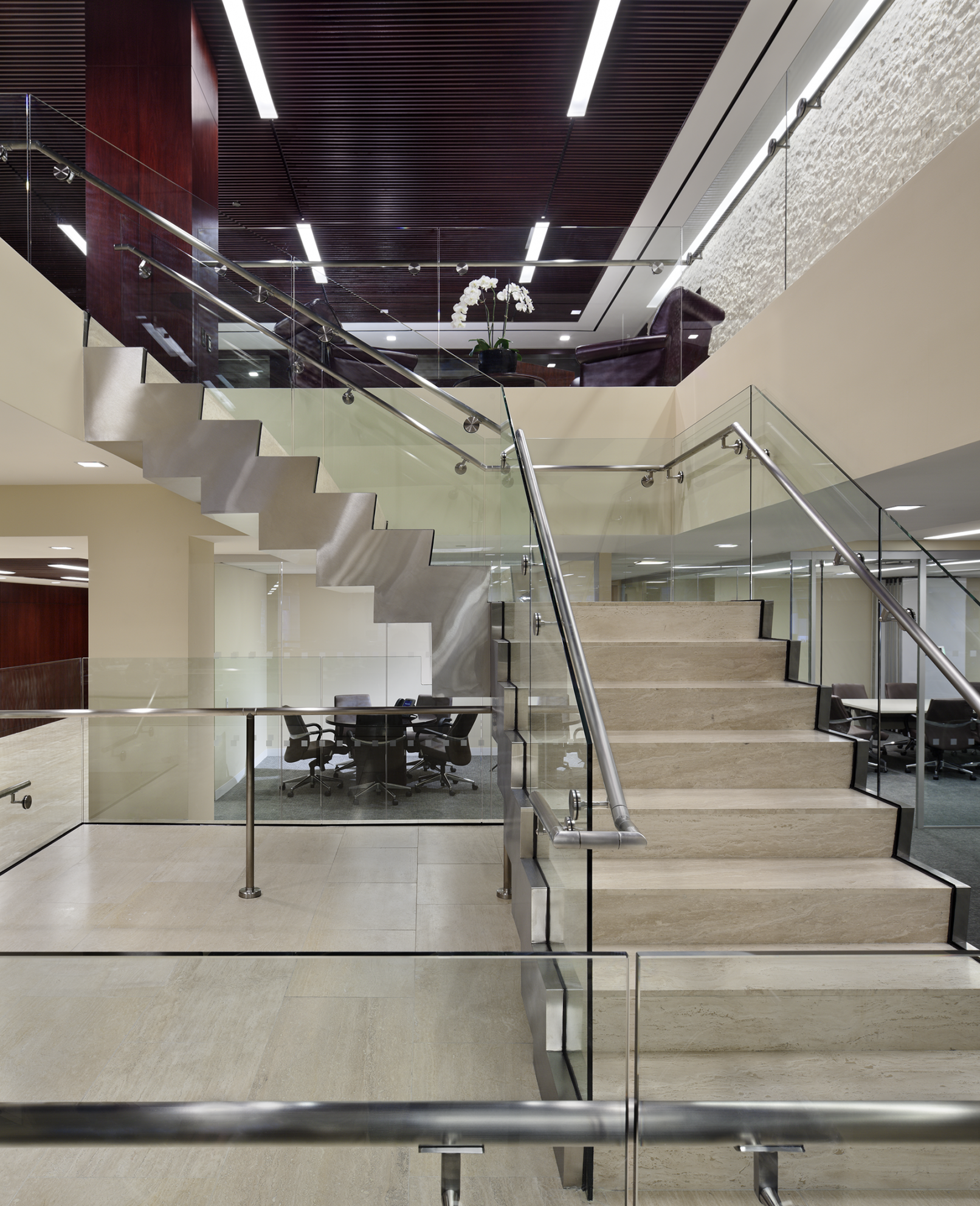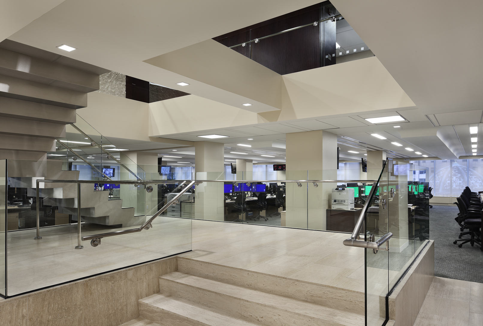 Janko Rasic Architects was selected to design Mizuho Securities USA Inc.’s headquarters and 250+ person trading floor. A floating stair connects executives with the trading floor. Wood, stone, steel, and glass are used to create an elegant yet durable workspace.