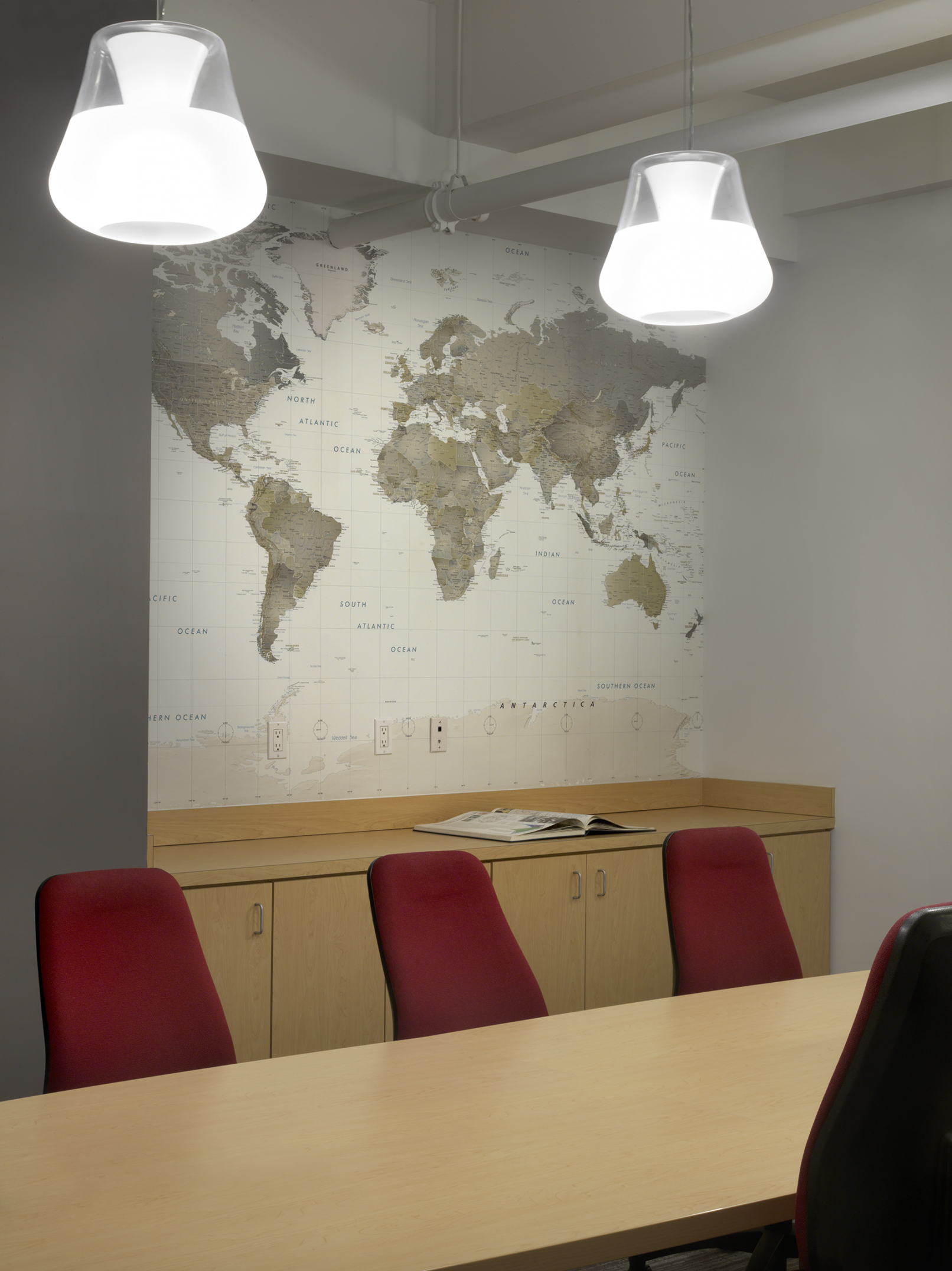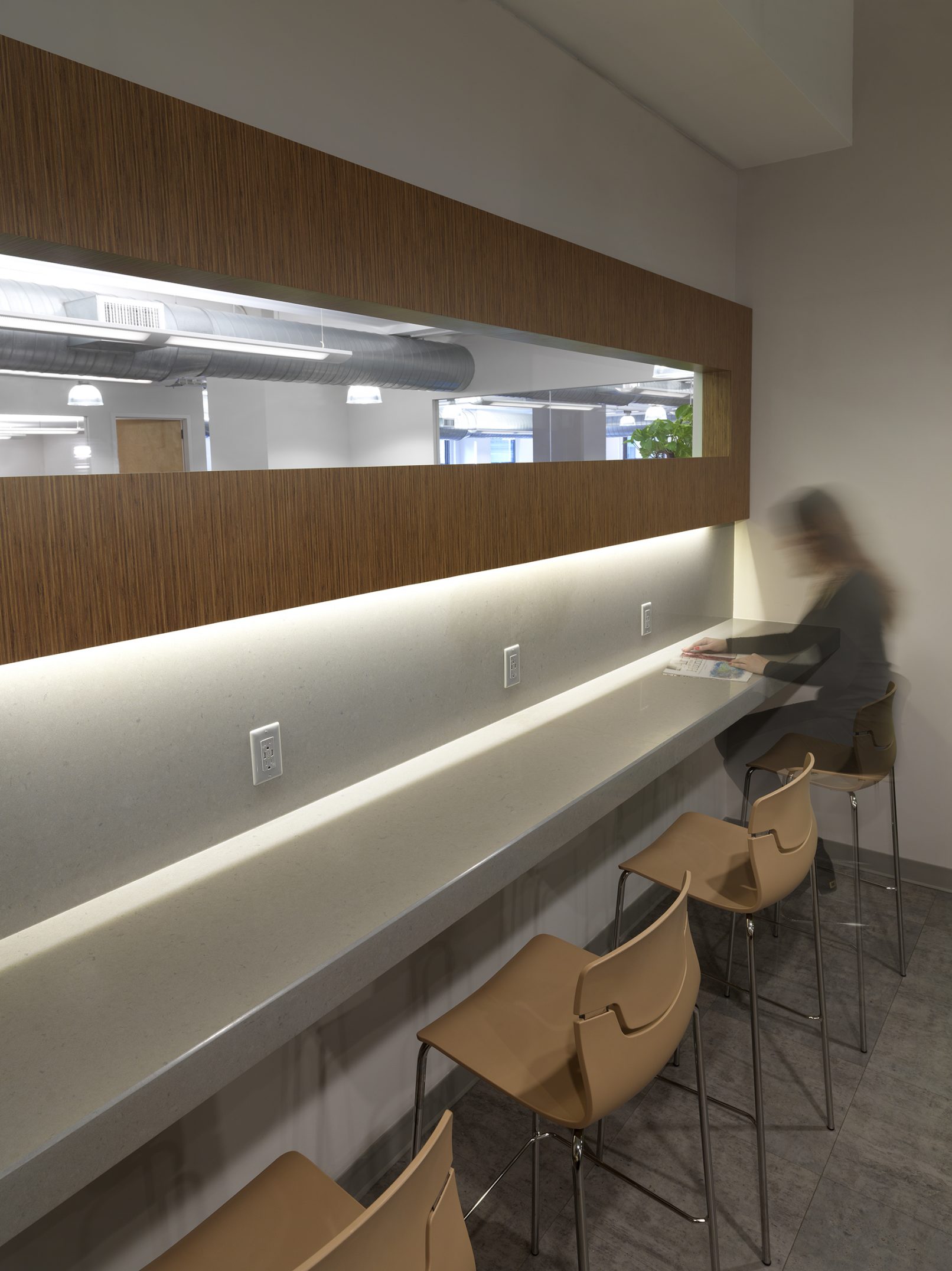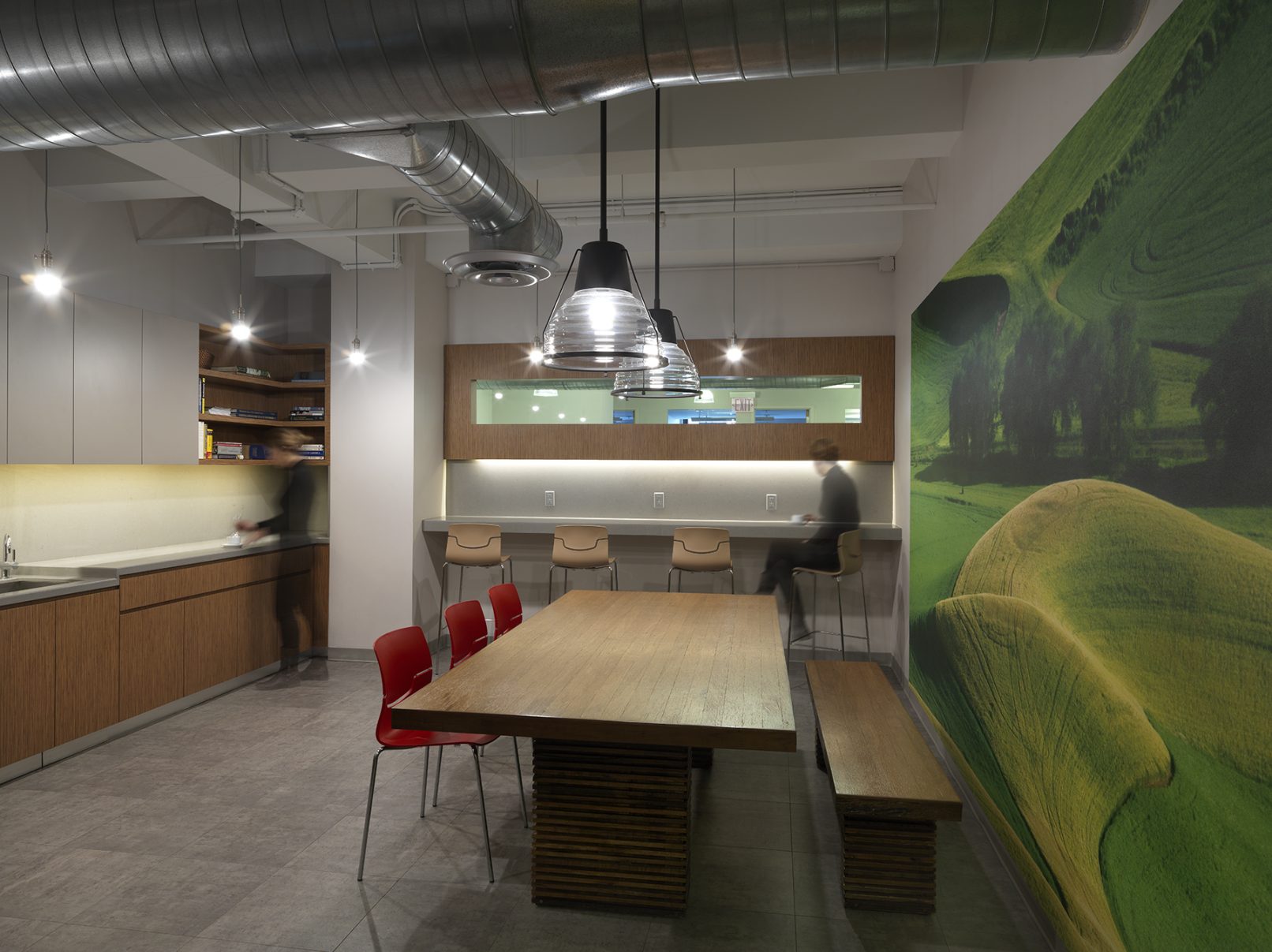 When New World Travel, a tour operator specializing in North America, renewed its lease; they decided to use the tenant improvement allowance to refurbish its underutilized lunchroom and create an amenity for all. Janko Rasic Architects created a comfortable café for informal meetings, staff breaks and lunches. A large photograph of rolling green hills brings the outdoors inside while wood tones and solid surface tops provide warmth and durability for the now popular space.