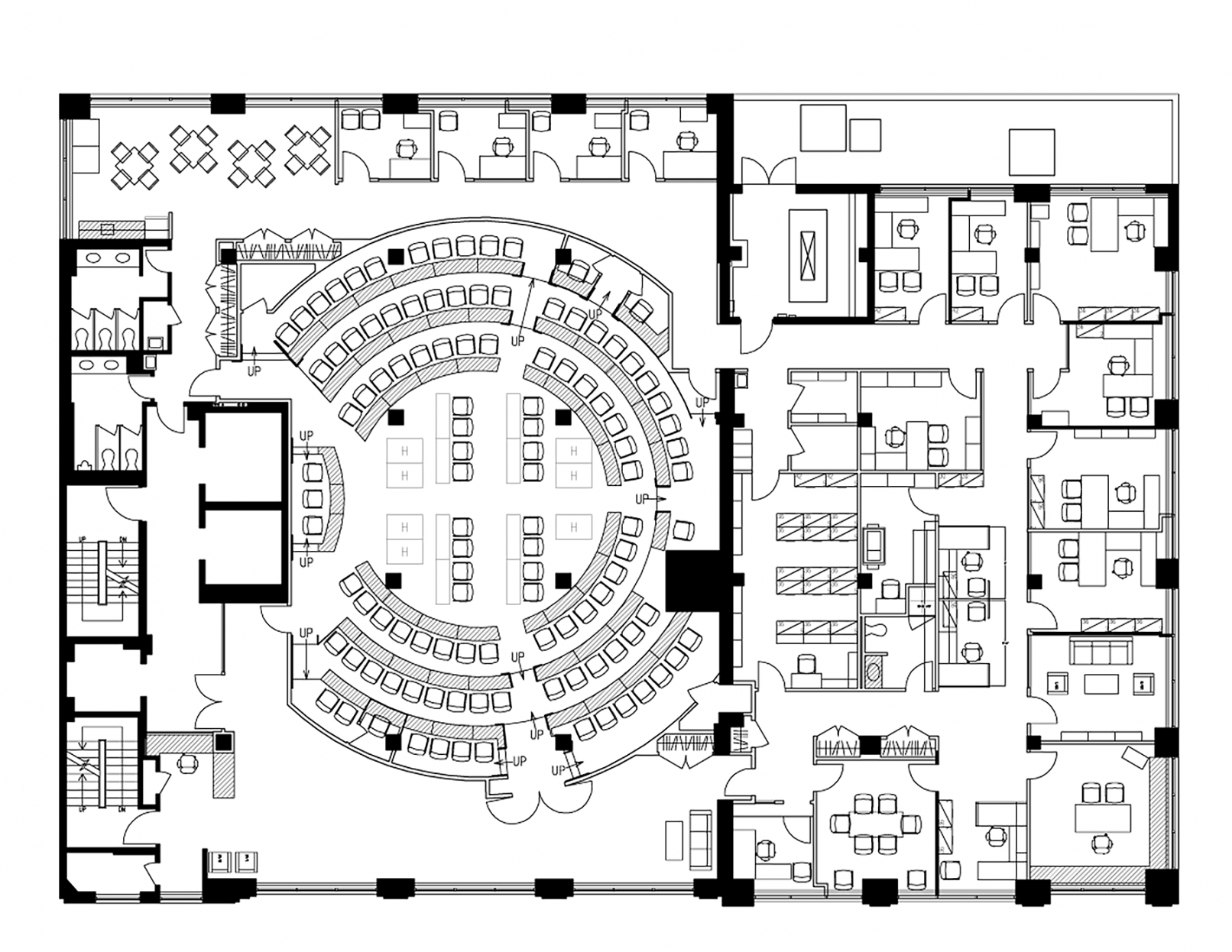 The Permanent Observer Mission of the African Union to the United Nations, which represents 53 countries, engaged Janko Rasic Architects to design a new council chamber and administrative offices for use by the UN Ambassadors. Originally built as industrial space in the 1920’s, the floor combines two separate buildings. In addition to the 120-person council chamber, facilities include a reception gallery, cafeteria, and offices for the professional staff. To compensate for the building columns, an audio visual system maintains camera contact with all participants.